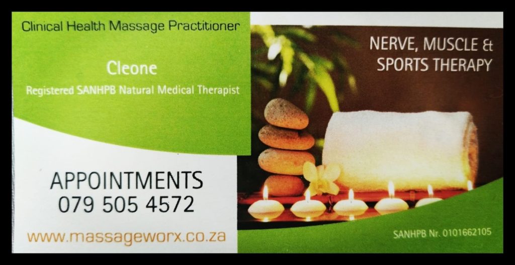 “Good day, I am a qualified therapist, home based in Moreletapark.